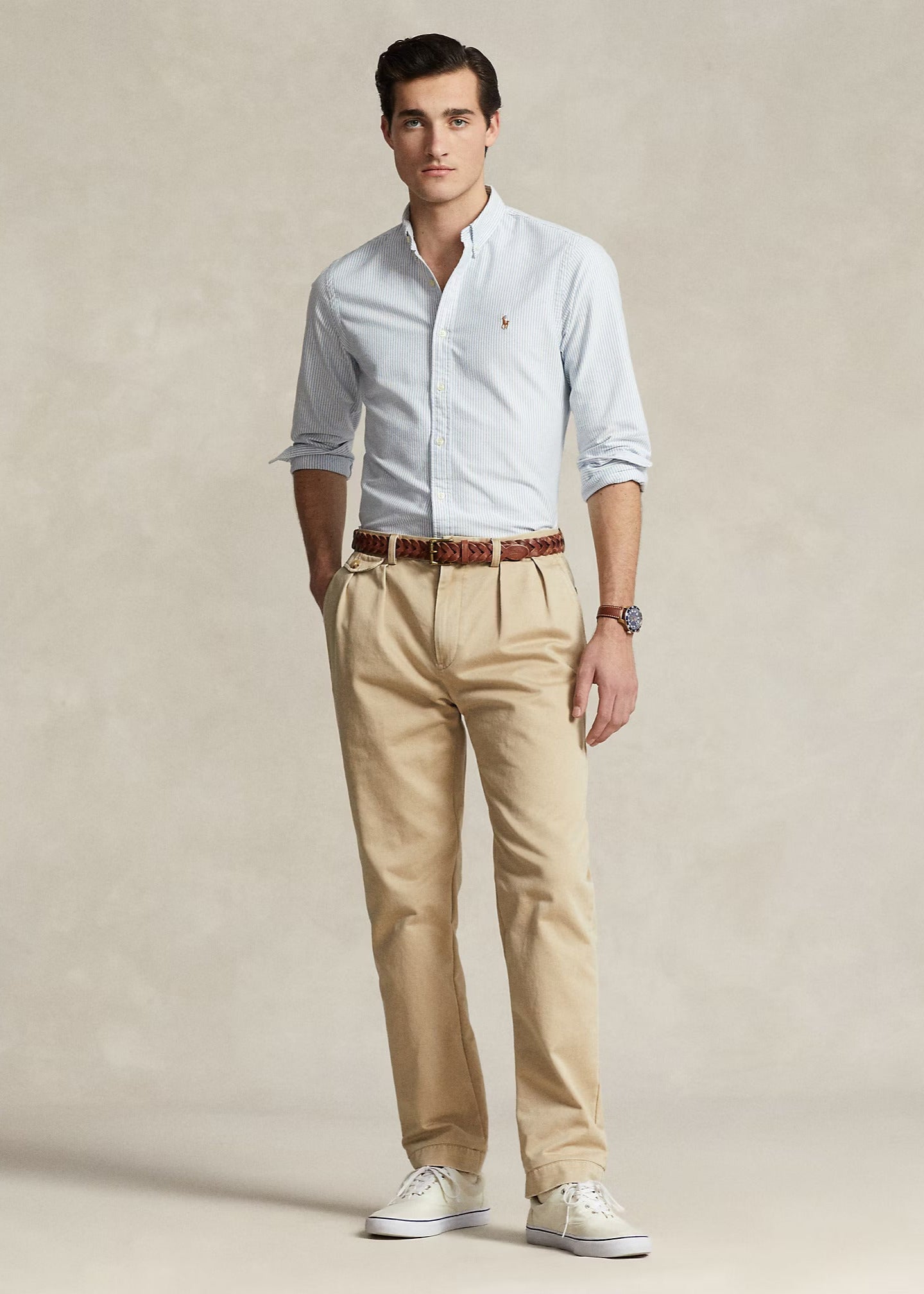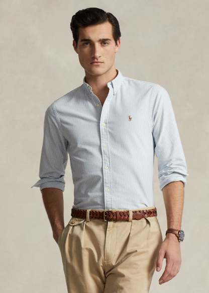 ð¡ Cette chemise Ralthtph Lauthtren a une coupe ajustée et taille normalement, choisissez votre taille habituelle. Sylvain mesure 1m85 et porte une taille M.