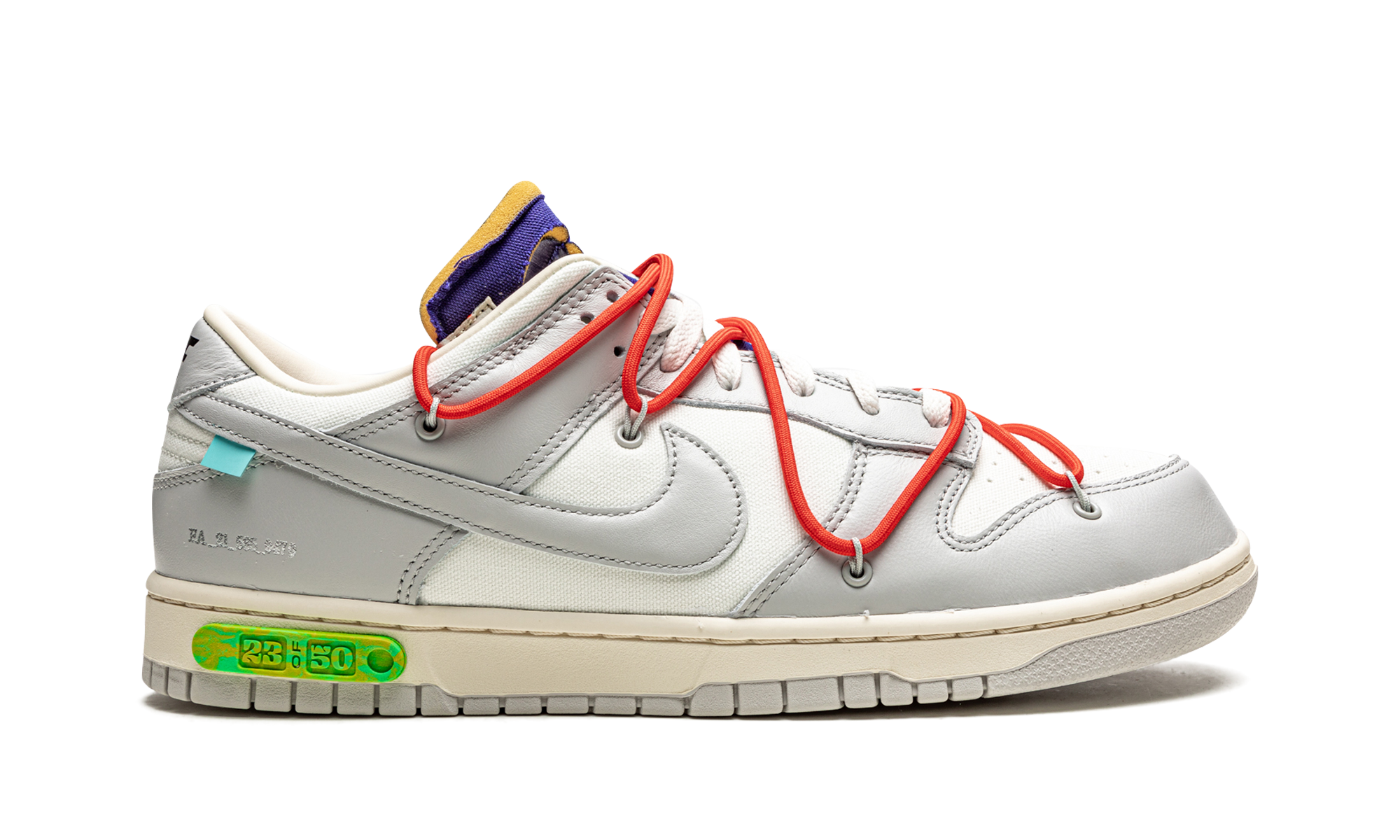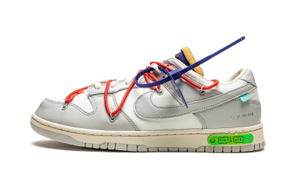 Nike Dunk Low Off-White Lot 23 přináší součást exkluzivní kolekce „The 50“ od Virgila Abloha a značky Off-White. Svršek kombinuje bílou kůži s šedými semišovými panely, doplněný o charakteristické detaily Off-White, jako je postranní textový potisk, plastový zip tie a dvojité šněrování v kontrastní barvě. Speciální číslování „23 of 50“ na patě a barevné akcenty dodávají jedinečný vzhled. Gumová podešev a pohodlná mezipodešev zajišťují celodenní komfort i autentický styl.