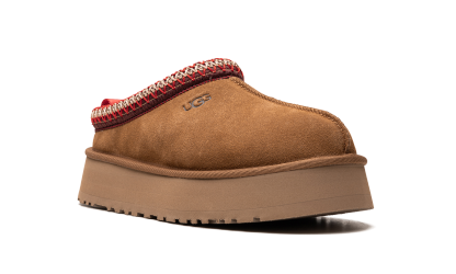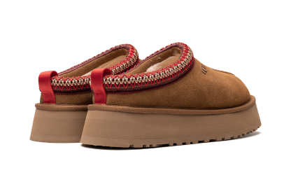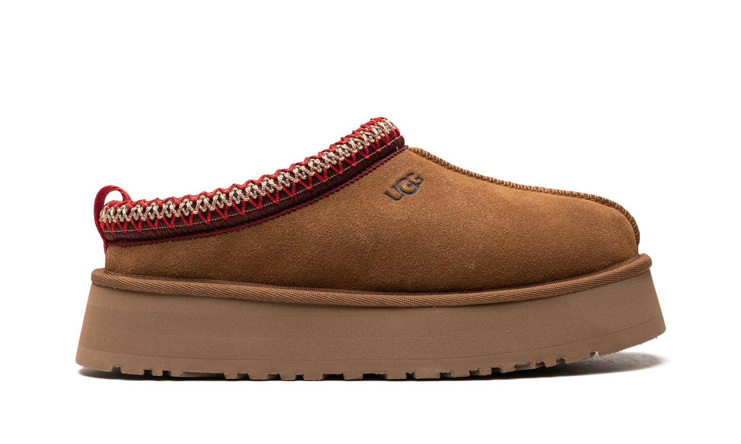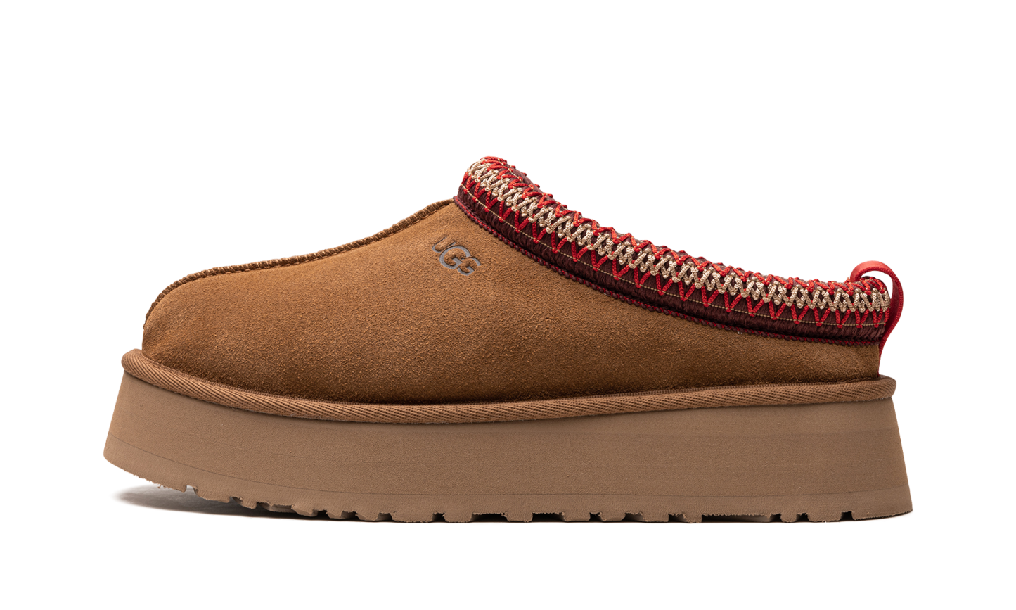 Papucul UGG Tazz în castan prezintă o căptușeală de piele intoarsa maro, cu o dungă de poliester reciclat roșu și alb. Căptușeala este concepută folosind Uggplush, care este lână reciclată combinată cu piei de oaie, în timp ce o talpă EVA echilibrată de 3,8 cm oferă suportul și confortul necesar.